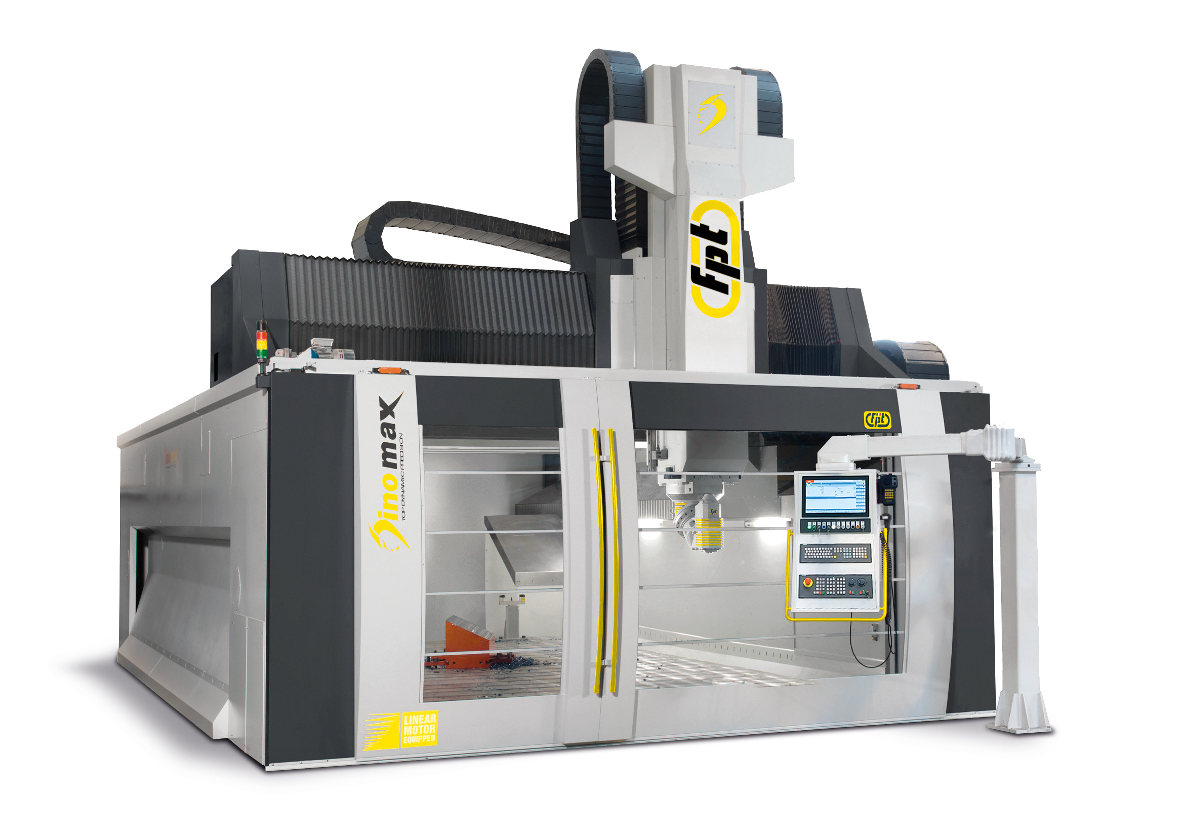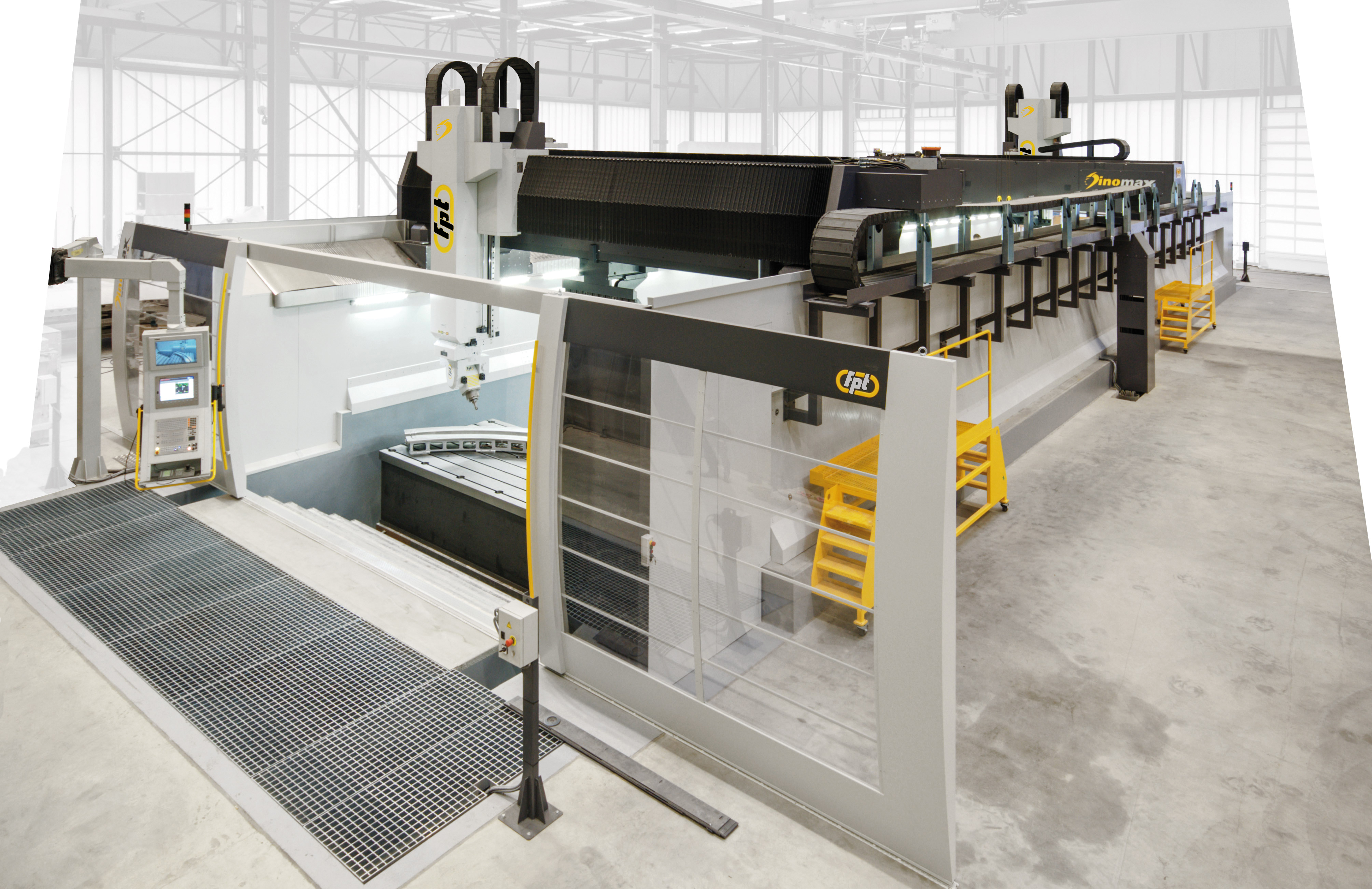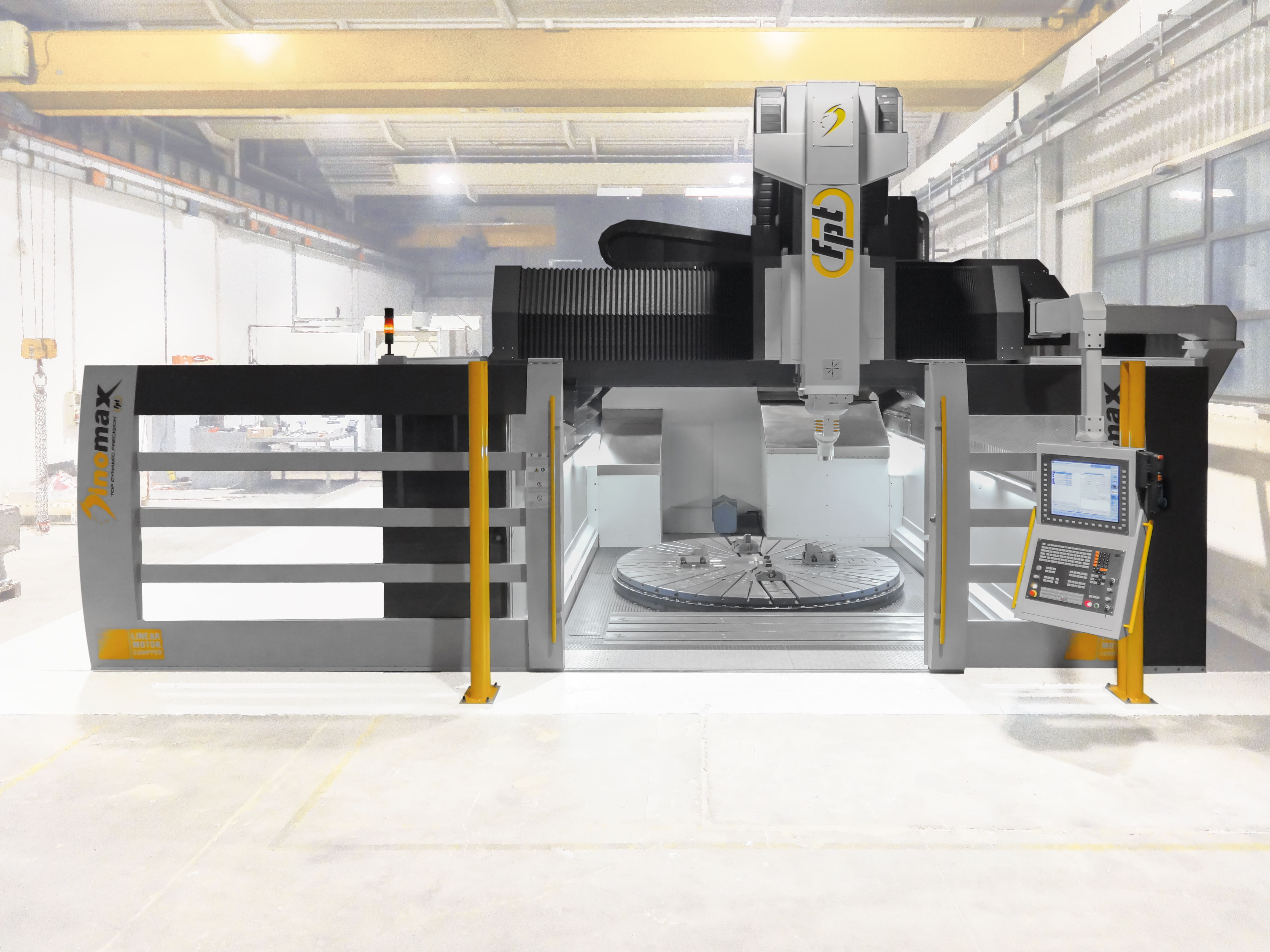 Dinomax is a large-format vertical milling machine designed for precision machining of oversized components. Built on a gantry-type architecture with FEM-optimized structures, Dinomax ensures maximum rigidity, vibration damping, and machining stability. Equipped with linear motors or dual-drive systems on the longitudinal and transverse axes, it delivers smooth, accurate motion with feedrates up to 50,000 mm/min.