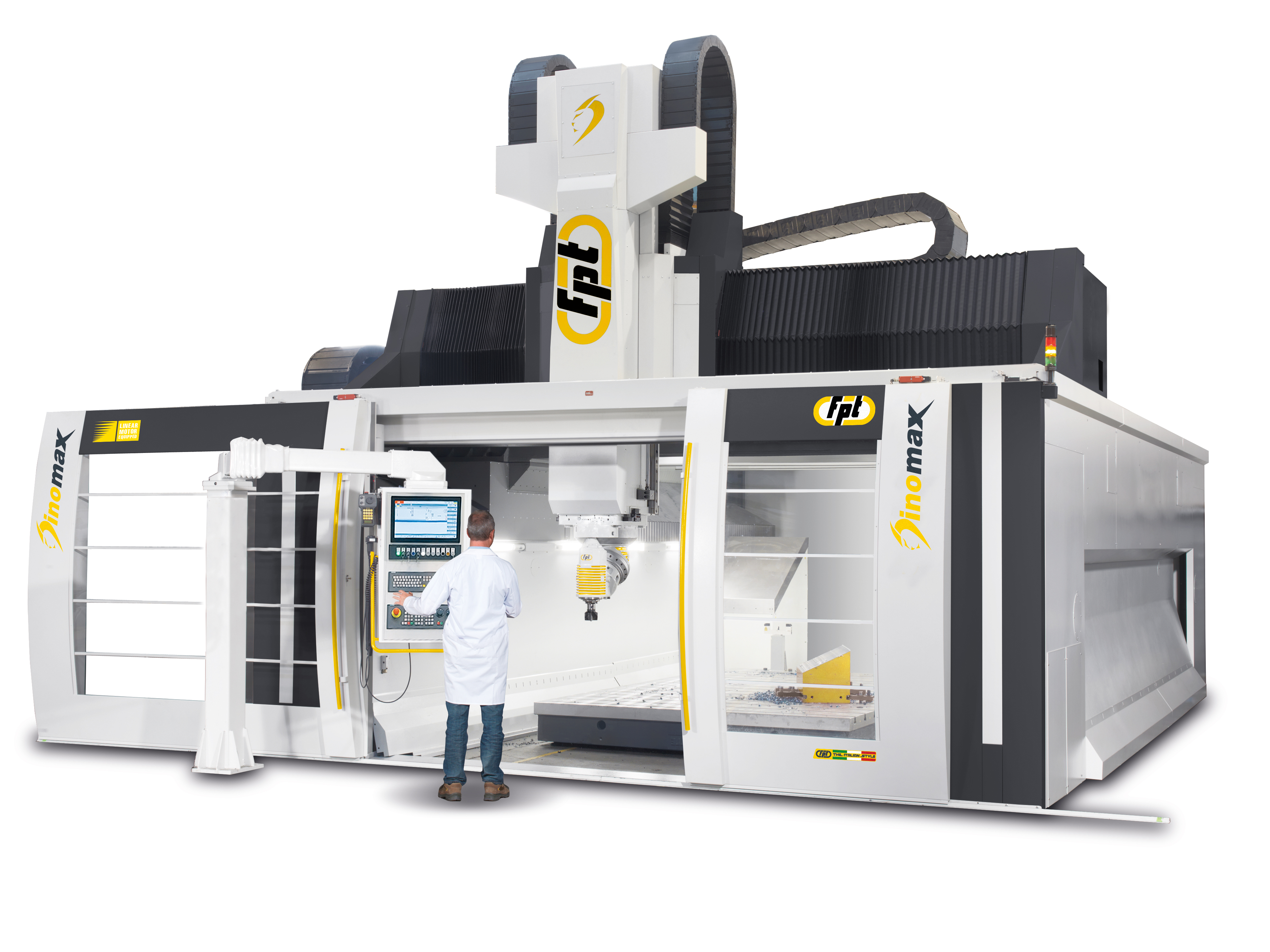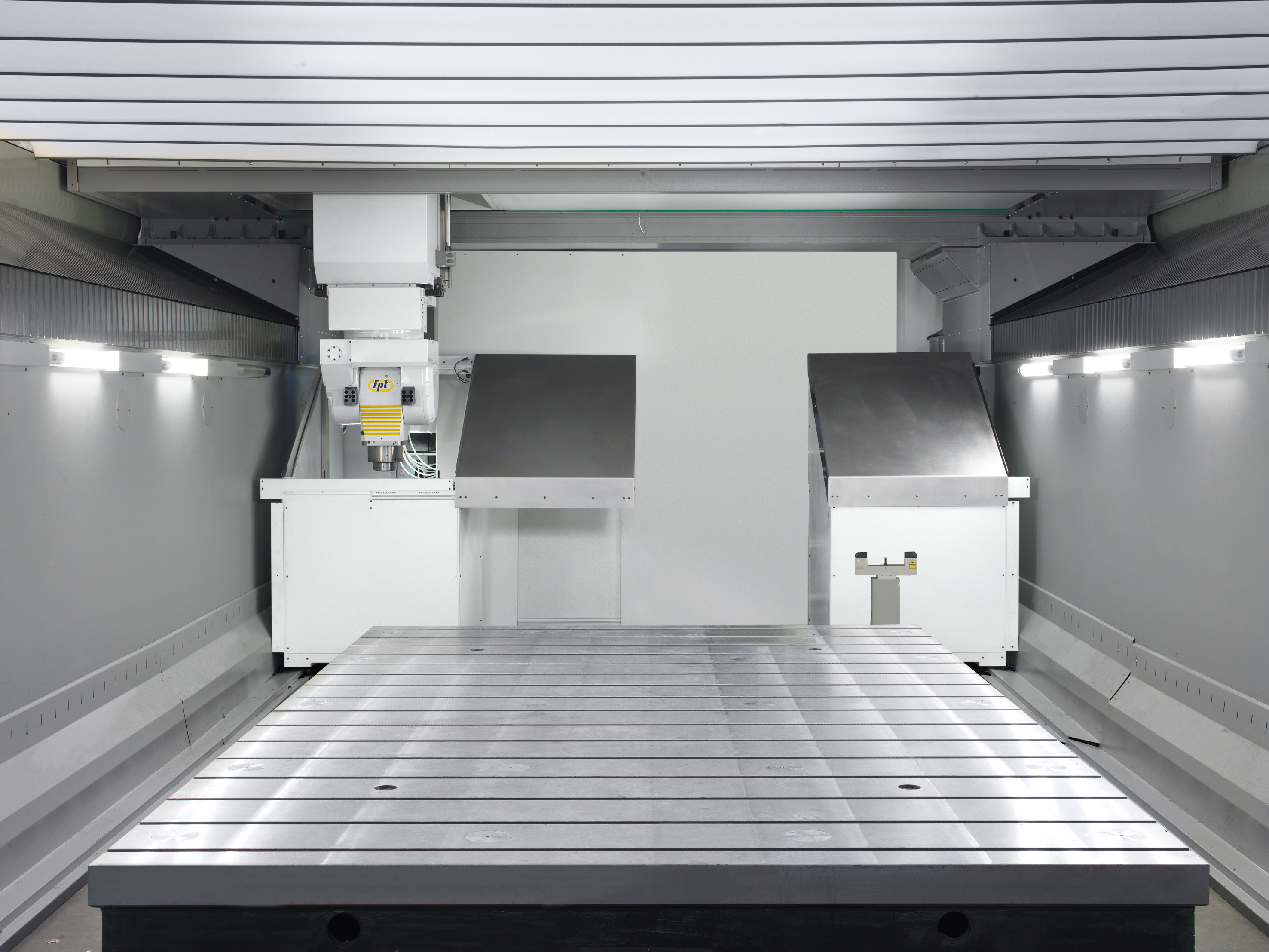 To protect accuracy over long cycles, the IAT – Intelligent Active Thermal control system automatically compensates for temperature variations between the machine and the workpiece, eliminating scale errors. A fully enclosed machining area with wide front sliding doors and optional servo-actuated roof ensures safety and operator convenience.