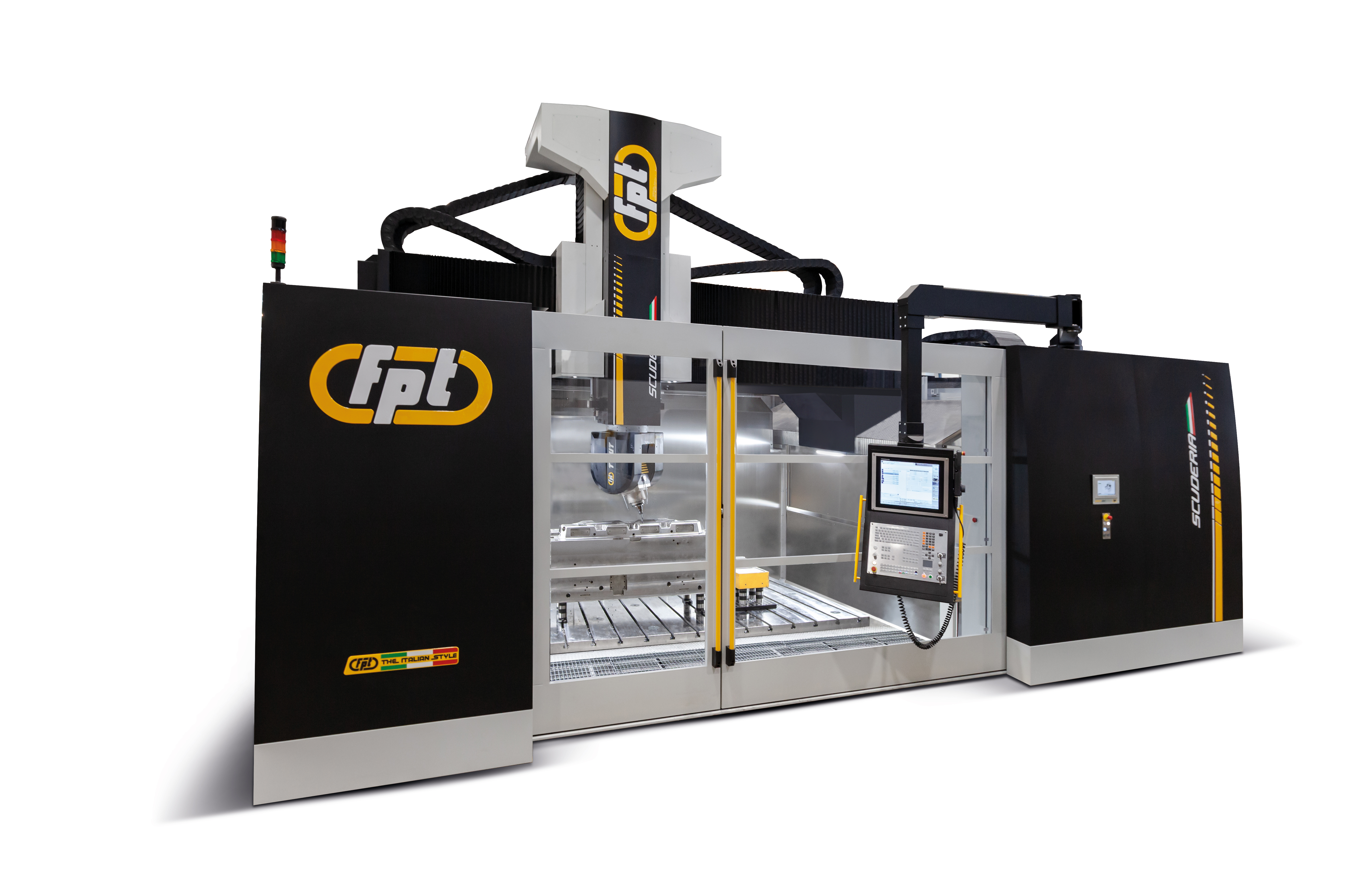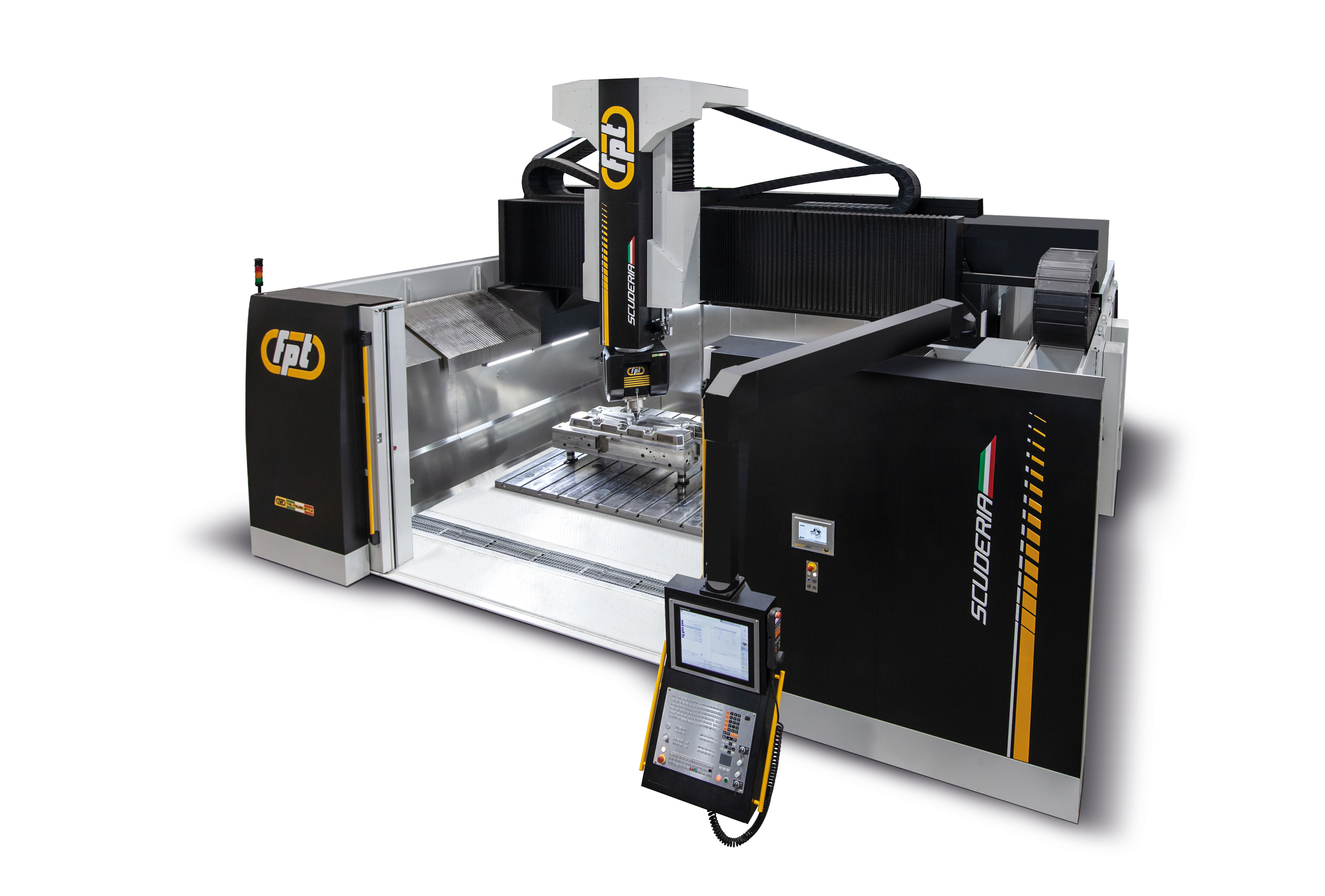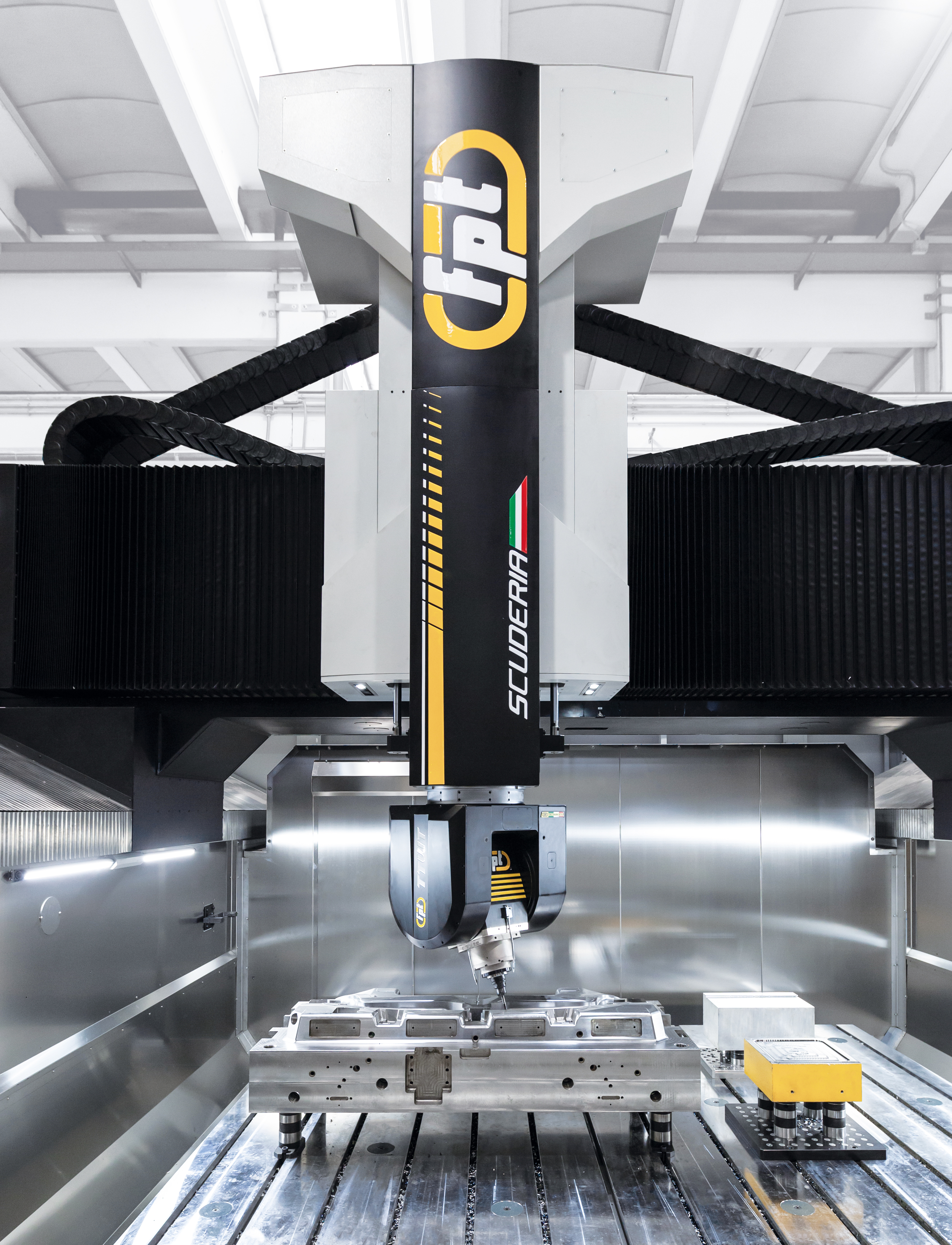 Scuderia is a state-of-the-art 5-axis vertical milling machine built to deliver absolute precision and performance in large-part machining. Its advanced gantry architecture and FEM-optimized cast-iron structures ensure maximum rigidity, while the integrated IAT – Intelligent Active Thermal control system eliminates thermal expansion errors by actively compensating for temperature variations during machining. Ideal For |