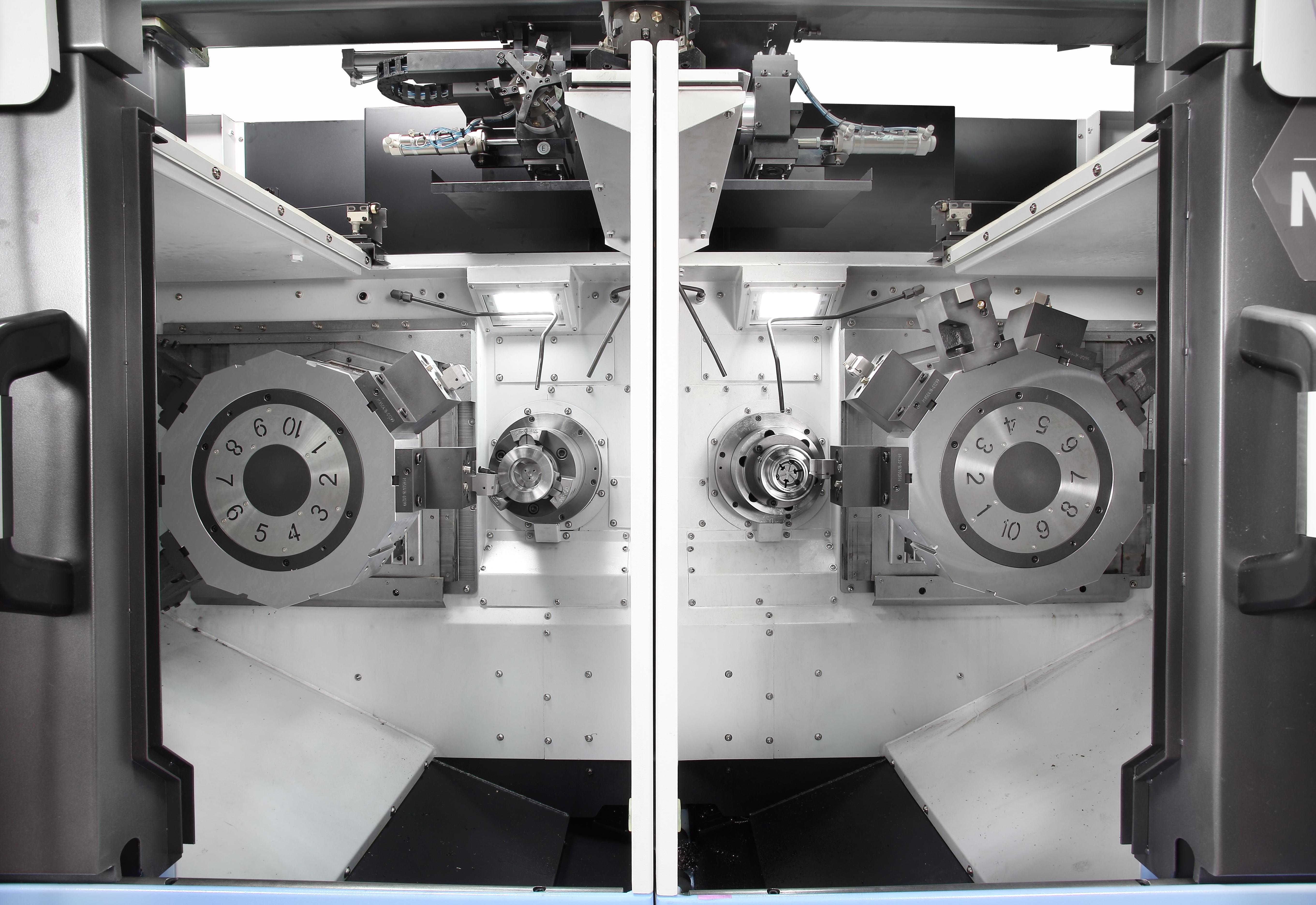 - Augsta produktivitāte: Divu vārpstu konstrukcja ļauj vienlaicīgi apstrādāt detaļas, ievērojami uzlabojot ražošanas efektivitāti.